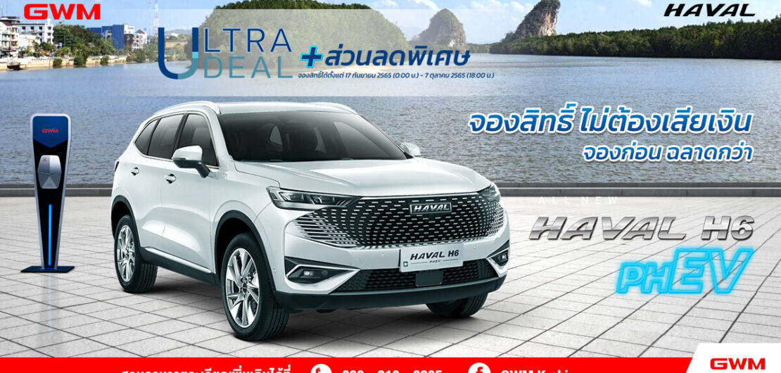 GWM Thailand จะเปิดรับจองสิทธิ์เพื่อซื้อ Haval H6 PHEV 2023 ใหม่ ในระหว่างวันที่ 17 กันยายน 2565 เวลา 00.00 น. ถึงวันที่ 7 ตุลาคม 2565 เวลา 18.00 น. โดยจะได้รับแคมเปญ ULTRA DEAL รวมมูลค่า 300,000 บาท