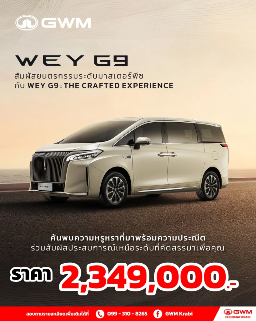 GWM WEY G9 (เวย์ จีไนน์) คือรถตู้ MPV ไฮเอนด์ 7 ที่นั่งรุ่นแรกในประเทศไทยจาก Great Wall Motor ที่ยกระดับความหรูหราและเทคโนโลยีอัจฉริยะสู่ตลาดครอบครัวพรีเมียม รุ่น WEY G9 Hi4 Ultra เปิดตัวในราคา 2,349,000 บาท มาพร้อมขุมพลัง Plug-in Hybrid ระบบขับเคลื่อน 4 ล้อ (Hi4 Intelligent AWD) ให้พละกำลังสูงสุดถึง 442 แรงม้า รองรับการขับขี่ทั้งในเมืองและทางไกลอย่างมั่นใจ พร้อมโหมดขับขี่ไฟฟ้าล้วนระยะทางสูงสุด 170 กิโลเมตร (มาตรฐาน NEDC)