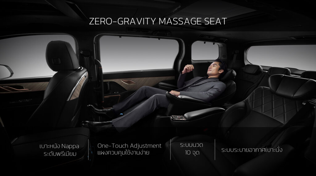 ห้องโดยสารหรูระดับพรีเมียมแบบ 7 ที่นั่ง (2+2+3) เน้นความสบายสูงสุด เบาะแถว 2 แบบ Zero-Gravity พร้อมระบบนวดไฟฟ้า ปรับไฟฟ้าหลายทิศทาง ให้ความรู้สึกเสมือน First Class มาพร้อมหน้าจออินโฟเทนเมนต์ขนาดใหญ่ ระบบอัจฉริยะ และเทคโนโลยีความปลอดภัยครบครัน ตอบโจทย์ทั้งครอบครัวและผู้บริหาร